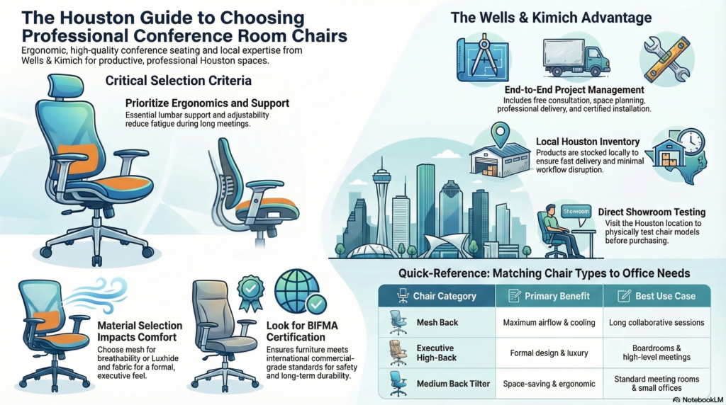 To choose the right conference room chairs in Houston, understanding the categories is important. Conference halls, meeting rooms, and executive spaces each have their own unique needs. At Wells & Kimich, there is a diverse collection of conference chairs so that managers and business owners in Houston can choose the best option according to their type of use, budget, and taste.
